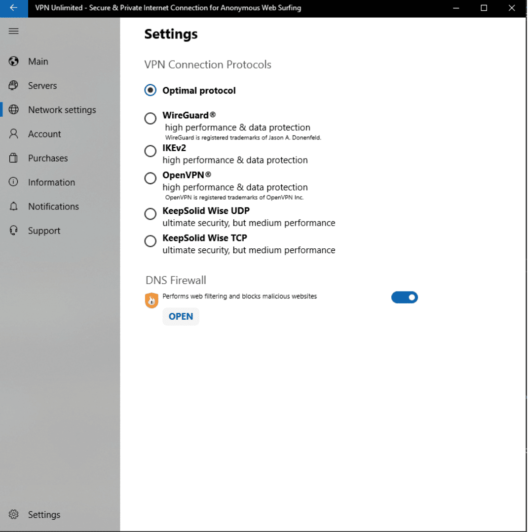 La pestaña de Configuración de red de Microsoft Store VPN de KeepSolid le permite elegir un protocolo VPN para su conexión: IKEv2, OpenVPN, KeepSolid Wise UDP, KeepSolid Wise TCP. Puede obtener más información sobre los protocolos VPN aquí.